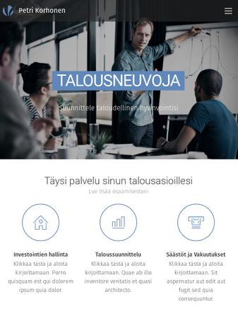 Täydellinen sivupohja talousneuvojille, yritys- tai verokonsulteille ja elämäntapavalmentajille. Selkeä rakenne auttaa vahvuuksiasi tulemaan esiin ja korostaa asiantuntemustasi.