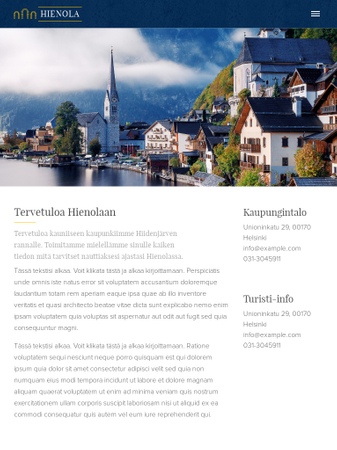 Tähän sivupohjaan mahtuu kaikki tärkeä tieto kotikaupungistasi. Sisällön voi helposti jakaa osioihin turisteille ja asukkaille. Sivuvalikon avulla voit luoda laajan kotisivun, missä kaikille uutisille ja ohjeille on paikkansa.
