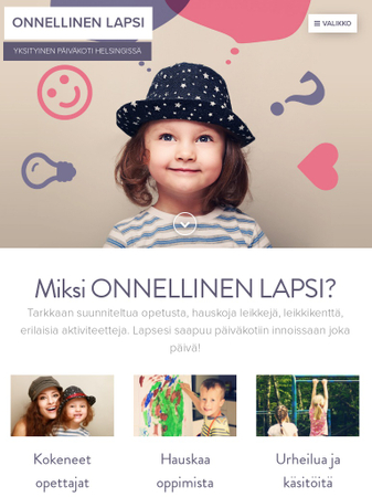 Tämä on täydellinen sivupohja päiväkodeille, kielikouluille ja lastentarhoille. Rakenne ja valmis sisältö näyttävät sinulle kuinka helppoa on jakaa tietoja kotisivuilla. Täydennä sivupohja omilla kuvillasi käyttämällä kuvagalleriaa.