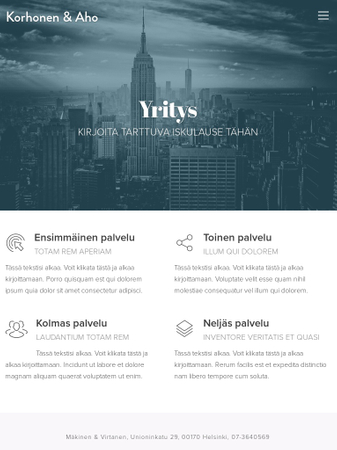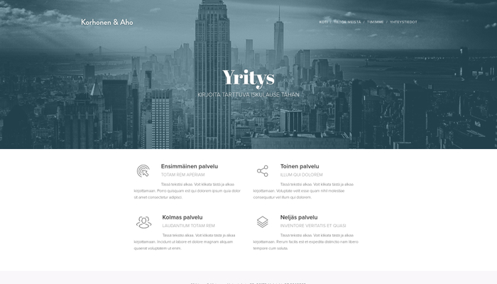 Selkeä design, suunniteltu kaikille yrityksille jotka haluavat siirtyä online-tilaan. Käytä kotisivuja keskittyäksesi palveluihin ja anna asiakkaiden tietää miksi heidän tulisi tulla käymään. Lisää osioita minne tarvitset ja anna yrityksesi kukoistaa.