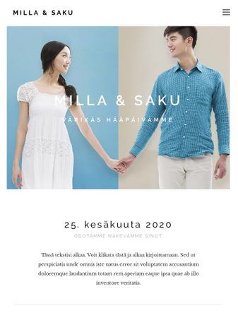Julkista hääsuunnitelmasi tyylillä tämän soman sivupohjan avulla. Kaikki tarpeellinen tieto on selkeästi järjestelty vieraitasi varten ja näet helposti kuka suunnittelee tulevansa paikalle RSVP -lomakkeen avulla.