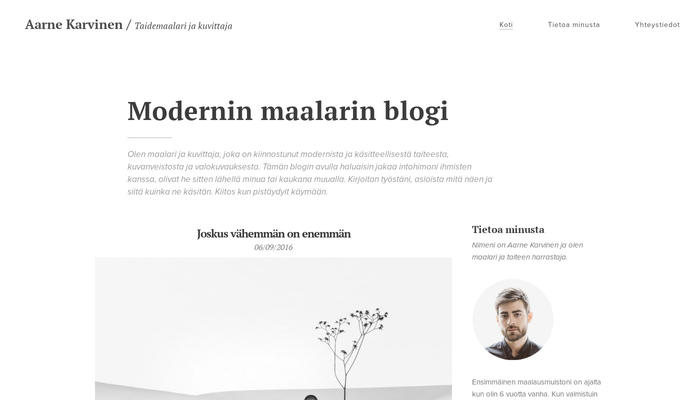 Sivupohja kaikille taiteellisille sieluille. Luo blogikirjoituksia taidetapahtumista, omista luomuksistasi, tuoreista trendeistä design-maailmassa ja muista taideuutisista. Tämä selkeä design päästää mielikuvituksen valloilleen ja tukee luovuuttasi. Blogikirjoitukset voi lisätä nopeasti, joten lukijasi tietävät aina mikä on uutta.