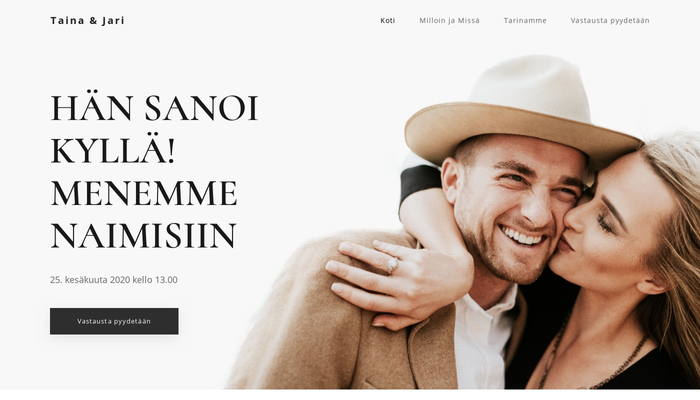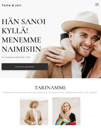 Suunnitteletko maalaishäitä? Luo sitten kotisivu samalla tyylillä. Tämä maanläheinen sivupohja on helppo ottaa haltuun. Jaa tärkeät tiedot vieraiden kesken ja kysy heiltä kaikki mitä sinun tarvitsee tietää simppelin "vastausta pyydetään" lomakkeen avulla.