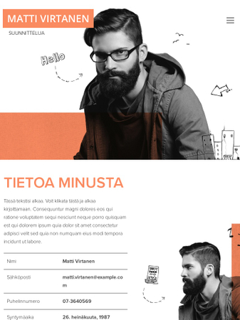 Etsitkö sivupohjaa CV:llesi tai portfoliollesi? Tämä malli on tehty sinua varten. Lisää taitosi, kokemuksesi ja esimerkkejä töistäsi ja uusi kotisivusi on valmis.