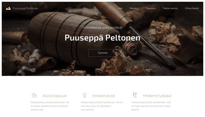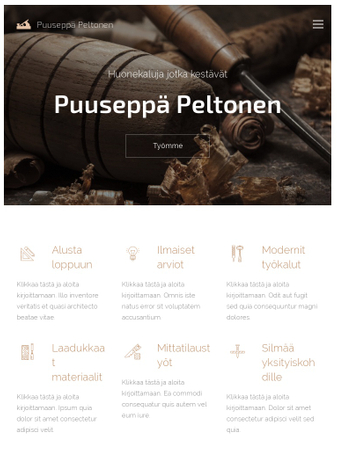 Tämän sivupohjan avulla voit luoda täydellisen kotisivun puusepän verstaalle. Maanläheiset värit ja upeat kuvakkeet täydentävät gallerioita jotka esittelevät töitäsi. Tyytyväisten asiakkaiden mielipiteet ja selkeästi esillä oleva puhelinnumero kutsuvat vierailijoita ottamaan yhteyttä. Tässä sivupohjassa on kaikki mitä taitava ammattilainen tarvitsee esitelläkseen yritystään.