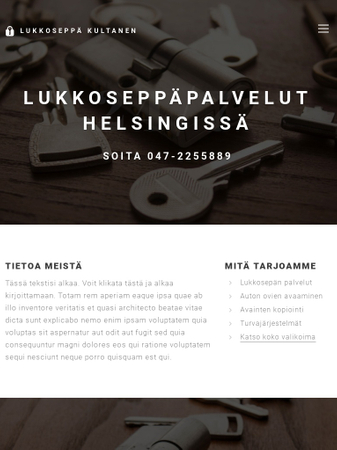 Tämä sivupohja on täydellinen lukkosepän liikkeelle. Esittele palvelusi suoraan kotisivullasi ja korosta tärkeät yhteystiedot kuten päivystyspuhelinnumerosi. Älä unohda lisätä tyytyväisten asiakkaiden palautetta sivuille todistaaksesi että olet kaupungin paras lukkoseppä.
